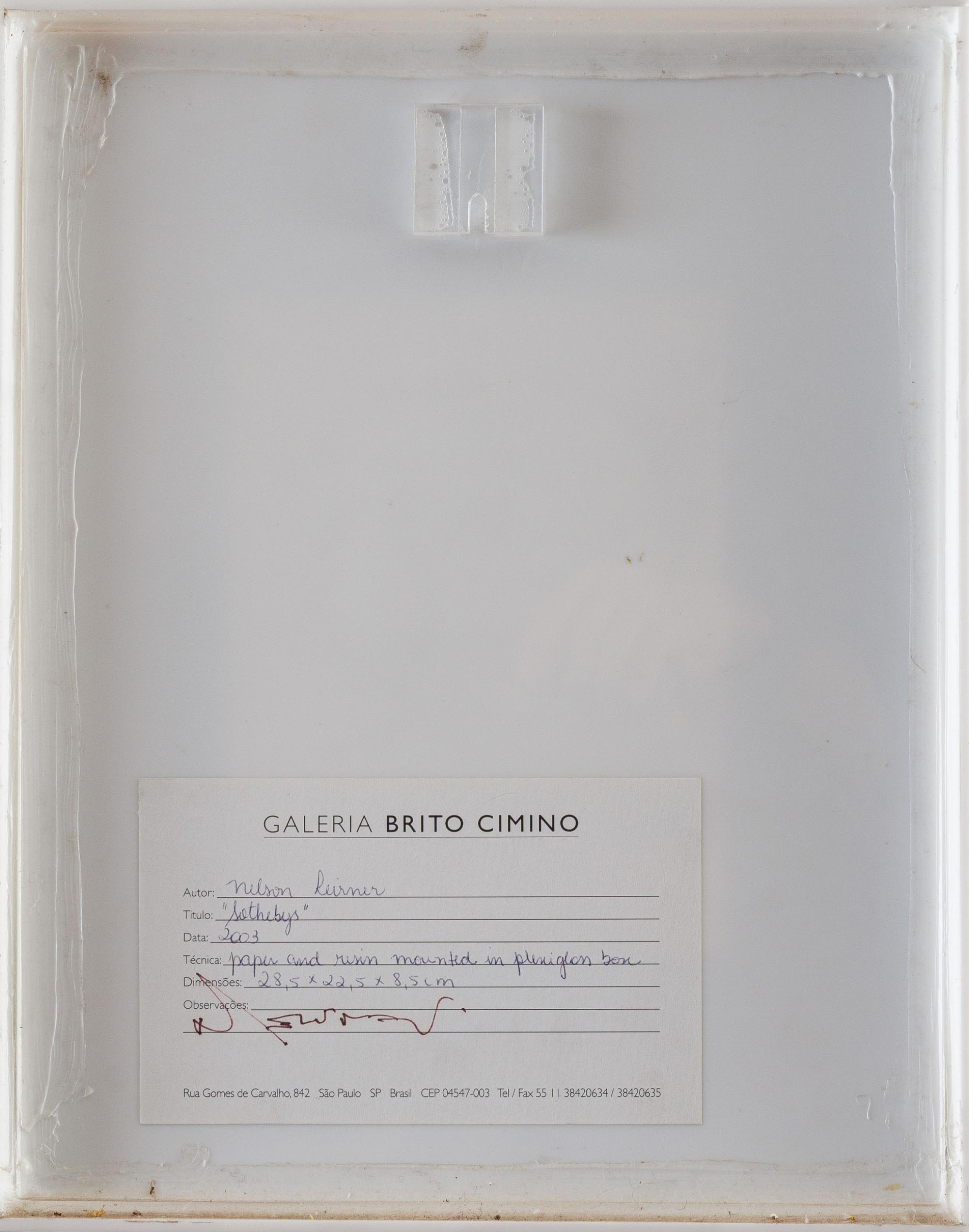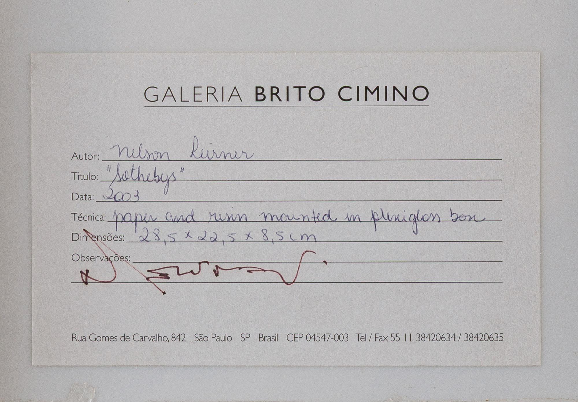 Sotheby’s, 2003, resina e papel montado em caixa de acrílico, 28,5 x 22,5 x 8,5 cm