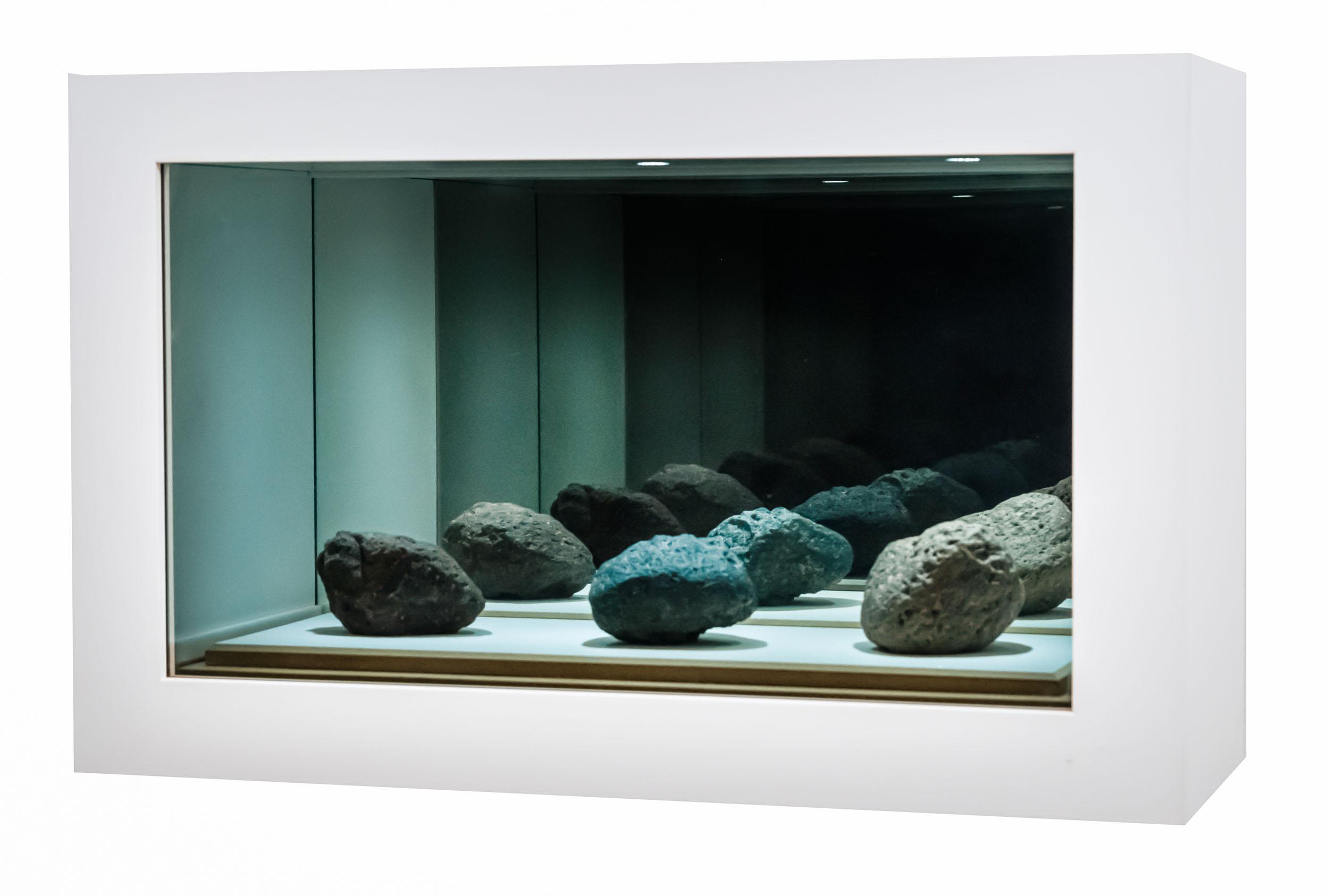 Santíssima Trindade, 2016, 1/3 + 2 P.A., caixa em madeira, vidro, espelho, papel, lâmpadas e pedras, 40,5 x 63 x 23 cm