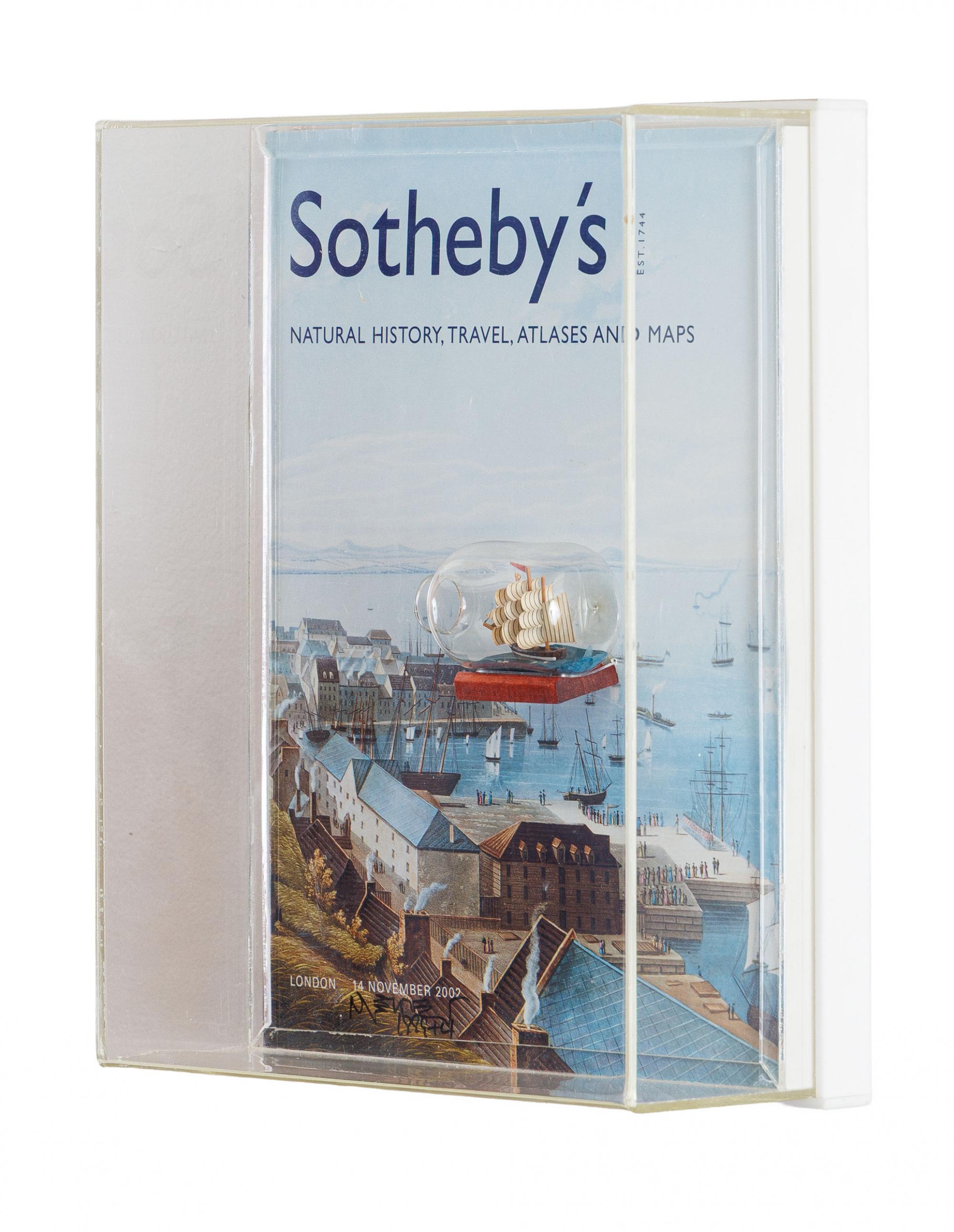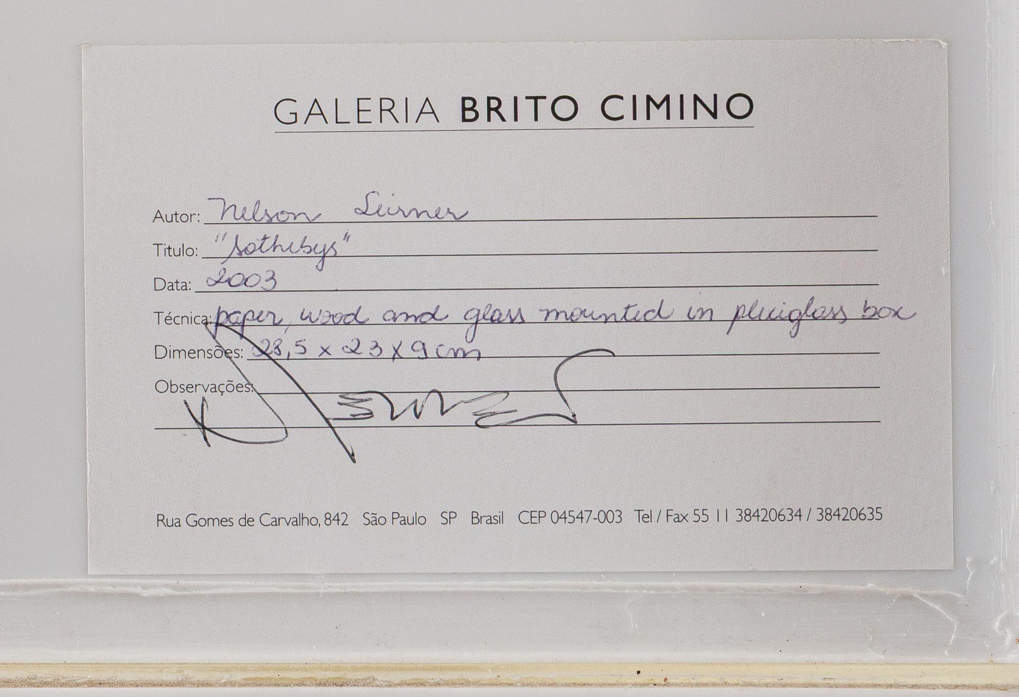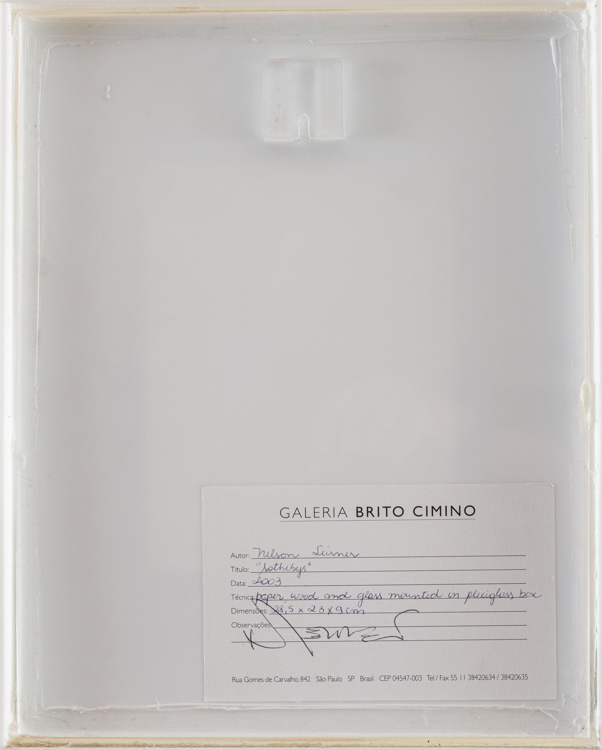 Sotheby’s, 2003, vidro e papel montado em caixa de acrílico, 28,5 x 23 x 9 cm