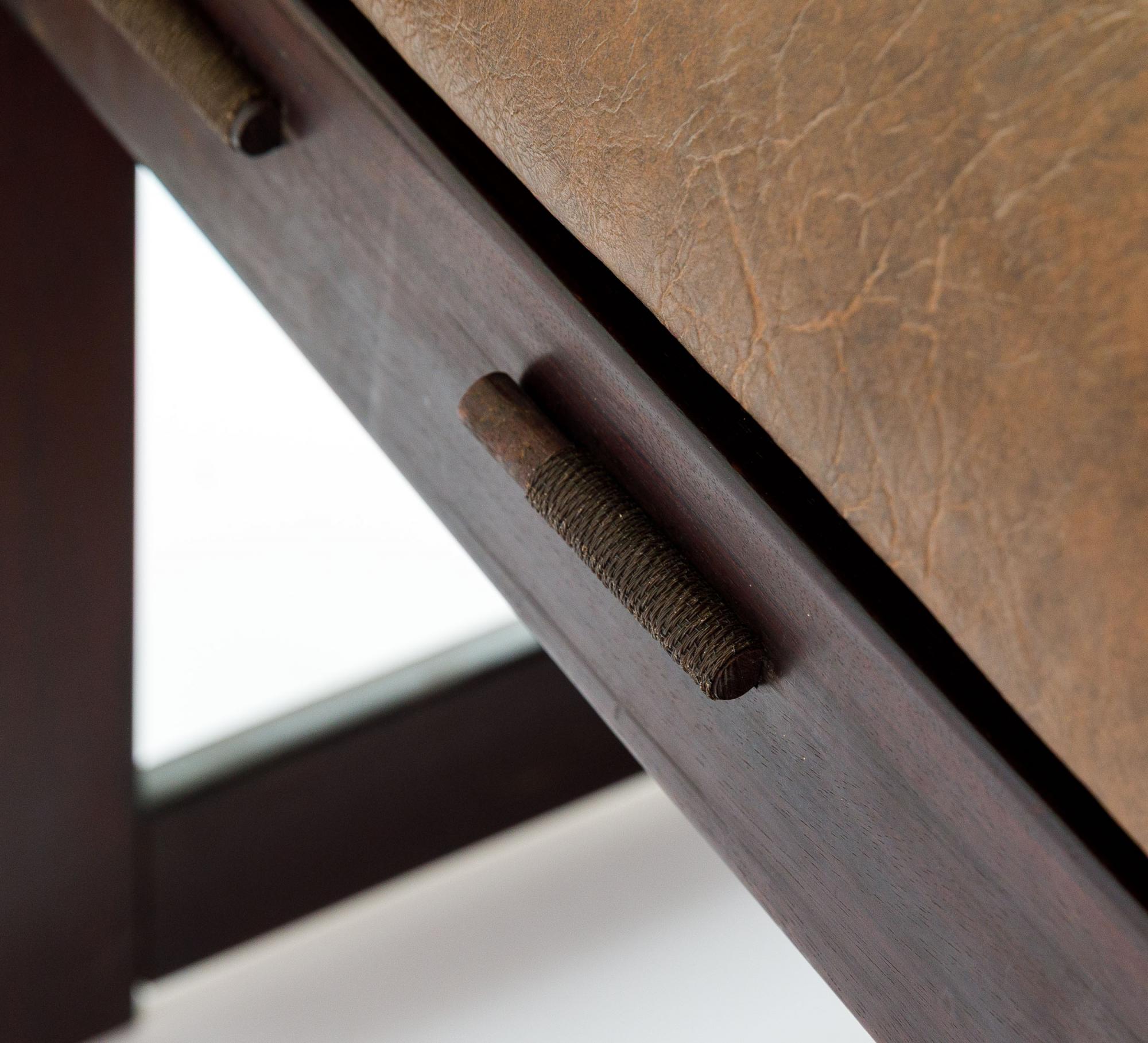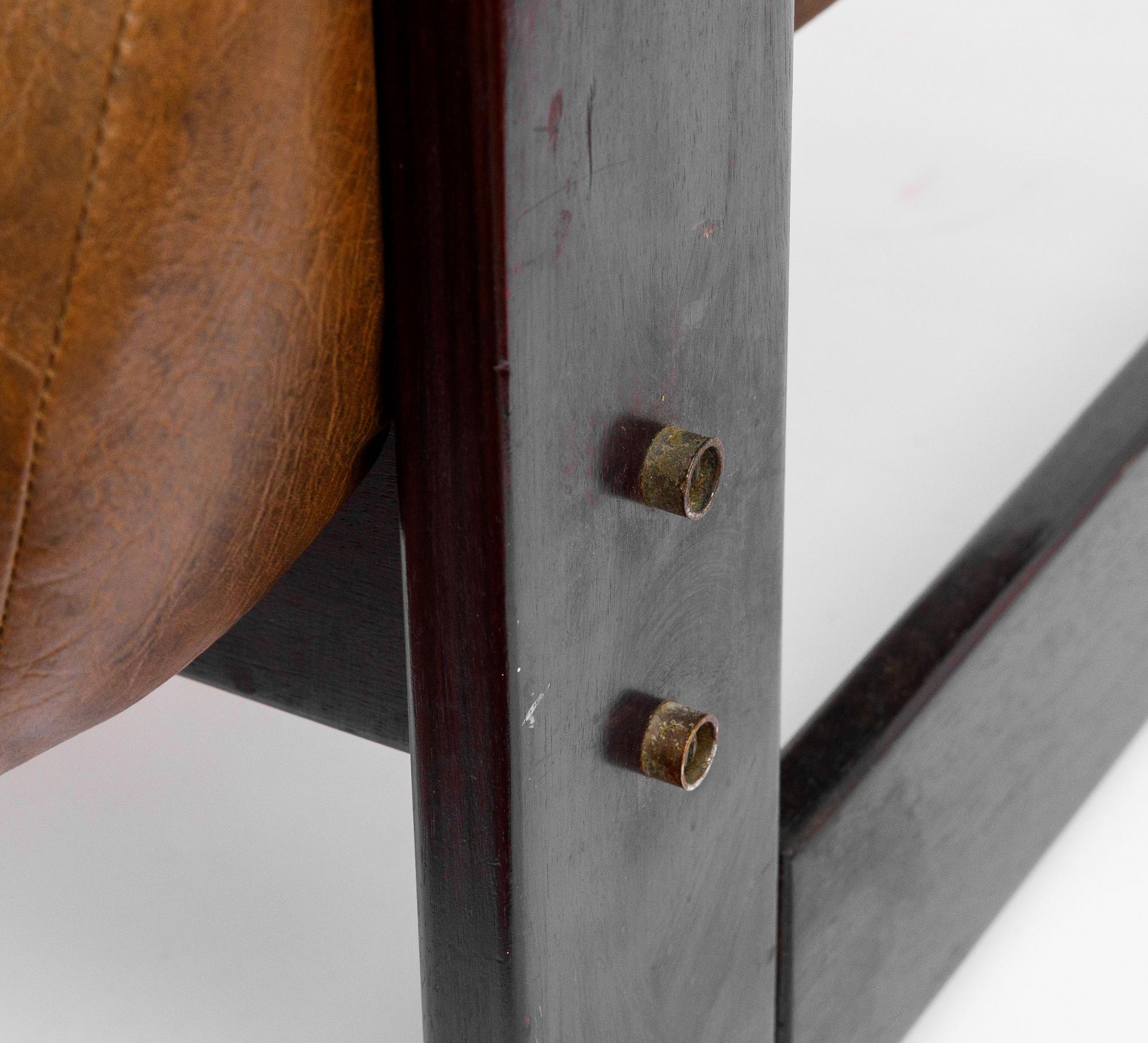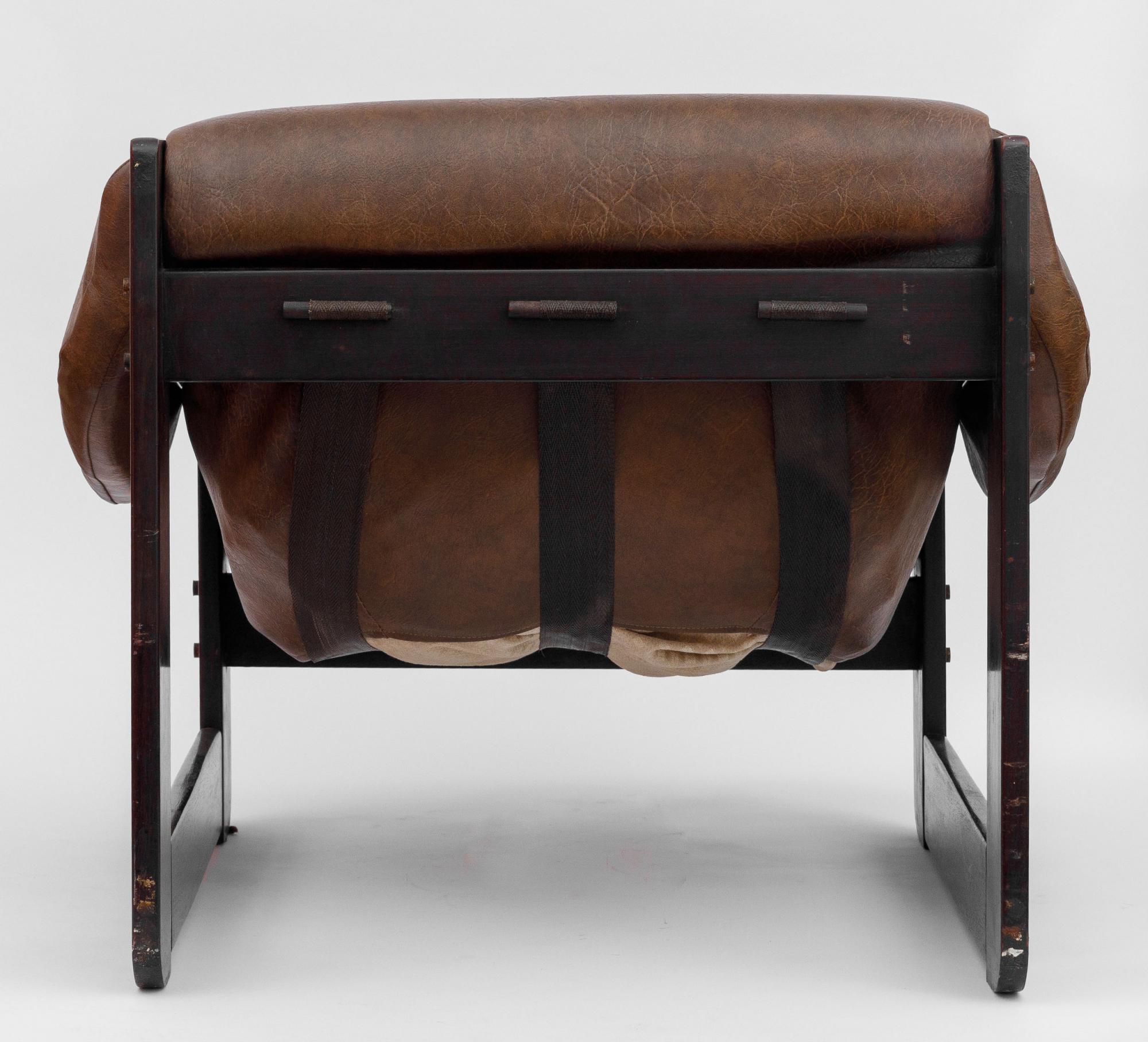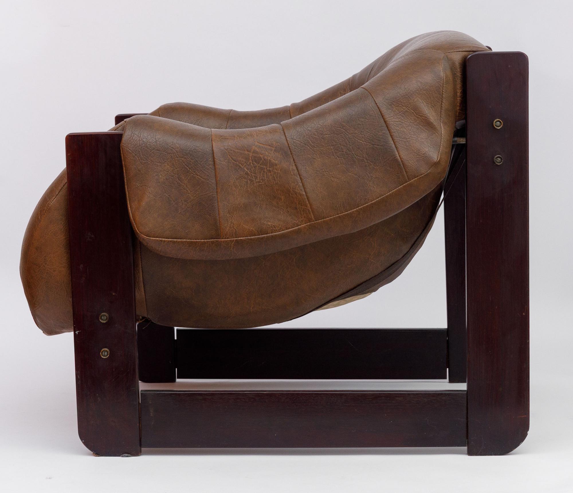 Par de poltronas MP-97, déc. 1970, estrutura executada em jatobá maciço, assento e encosto em corpo de espuma injetada sustentado por percintas e tirantes de metal nos braços, 67 x 82 x 82 cm (cada)